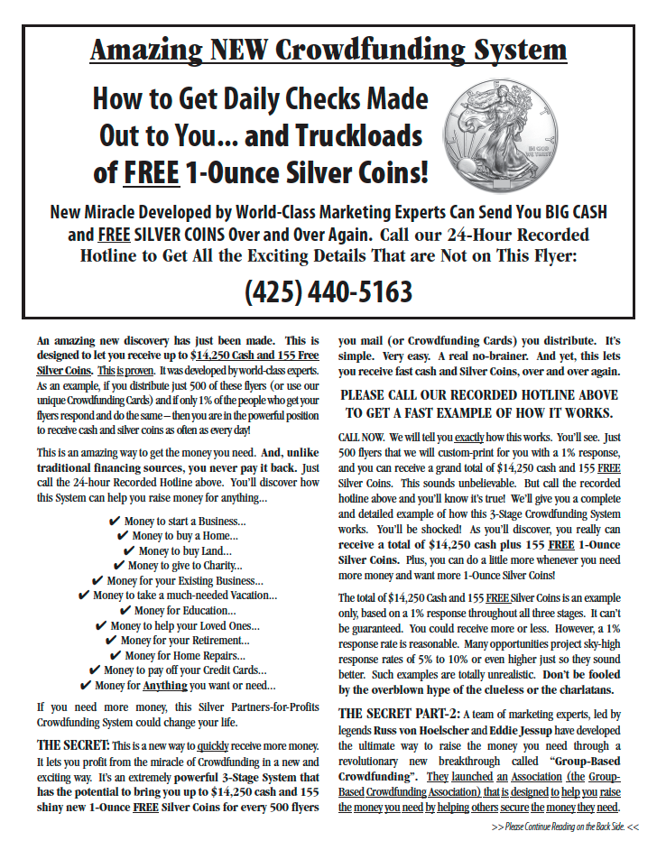 THE SECRET: This is a new way to quickly receive more money. It lets you profit from the miracle of Crowdfunding in a new and exciting way. It’s an extremely powerful 3-Stage System that has the potential to bring you up to $14,250 cash and 155 shiny new 1-Ounce FREE Silver Coins for every 500 Flyers or Cards you distribute. It’s simple. Very easy. A real no-brainer. And yet, this lets you receive fast cash and Silver Coins, over and over again.